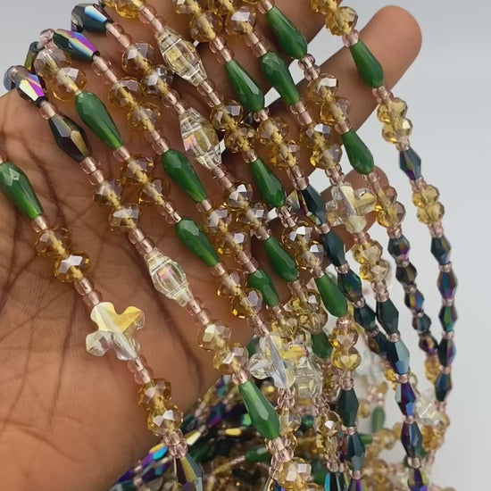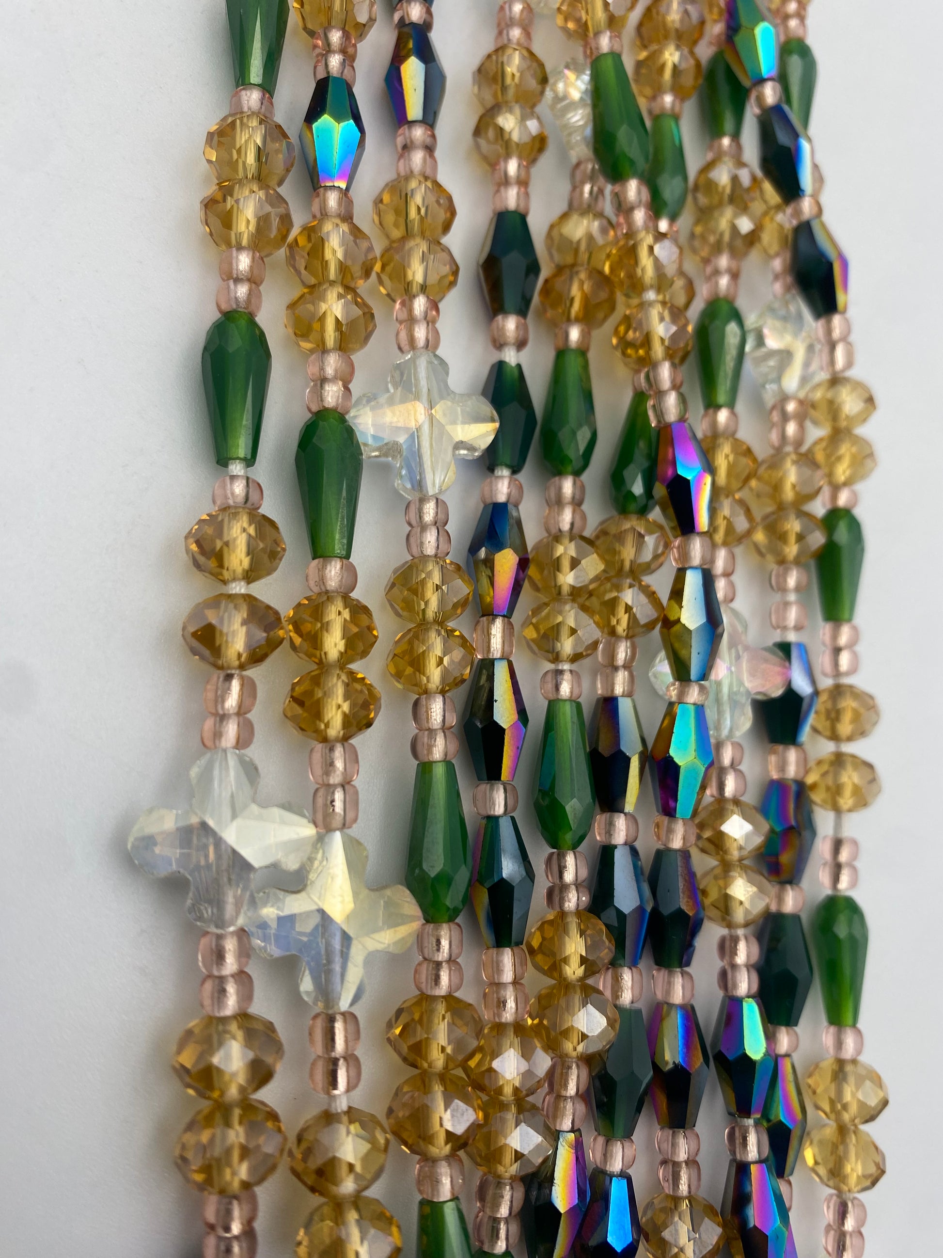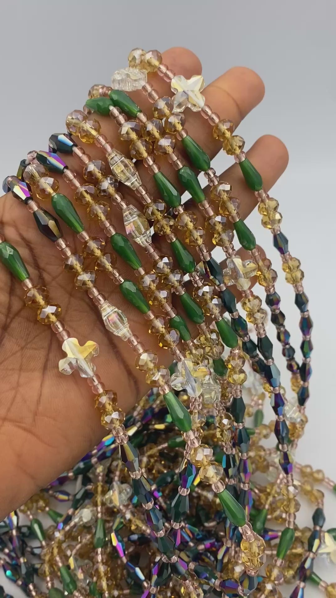 Royalty meets earth tones in the Sena strand. With its deep emerald greens, golden ambers, and clear crystal highlights, this waist bead whispers elegance and grounded beauty. A timeless design that speaks of strength, heritage, and divine light—Sena is a staple strand for the woman who carries grace like a crown.